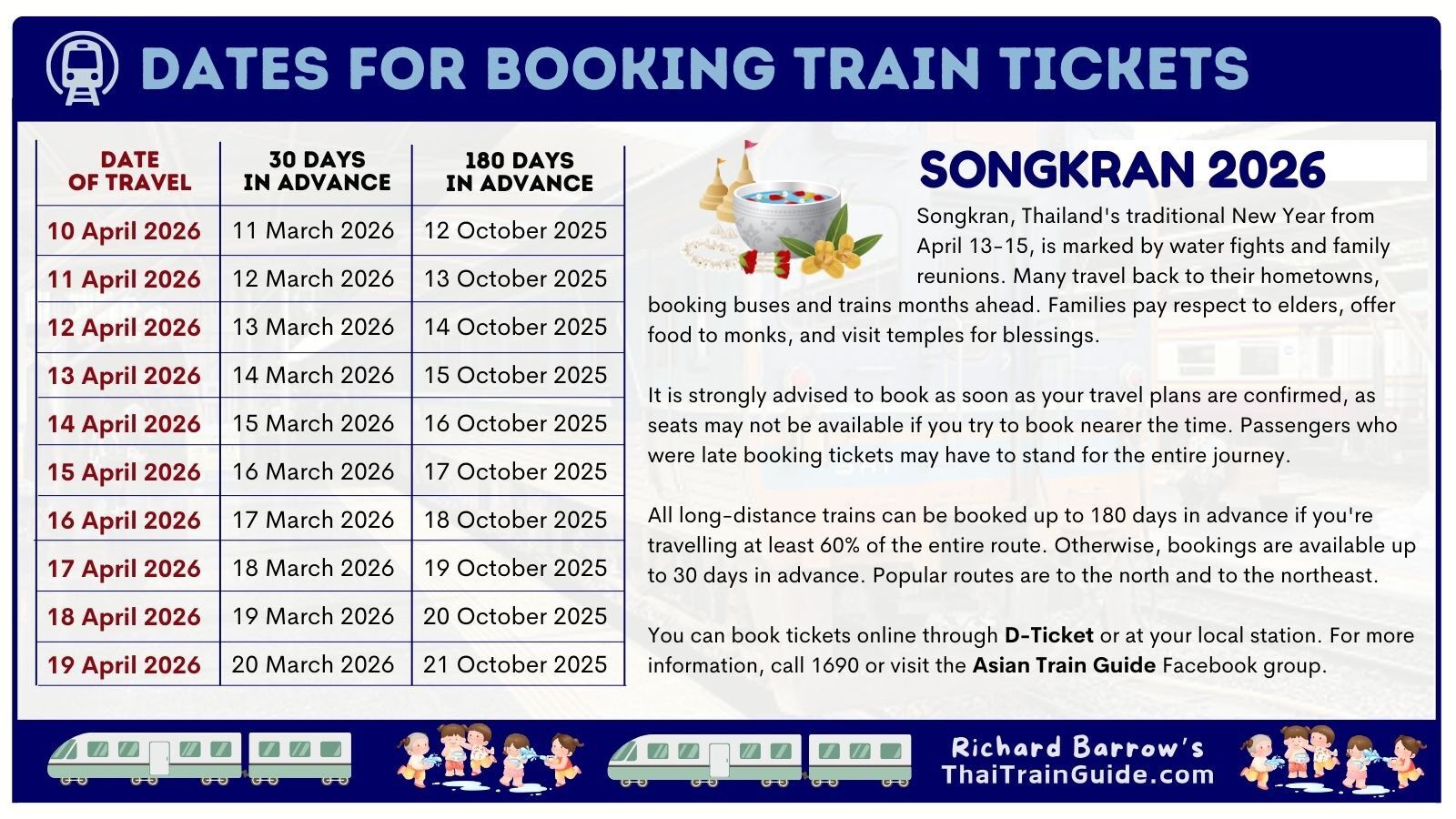 Are you planning to catch the train during the Songkran holiday? You can buy tickets up to 180 days in advance. Save this handy graphic to remind yourself when to purchase tickets for your travel days.